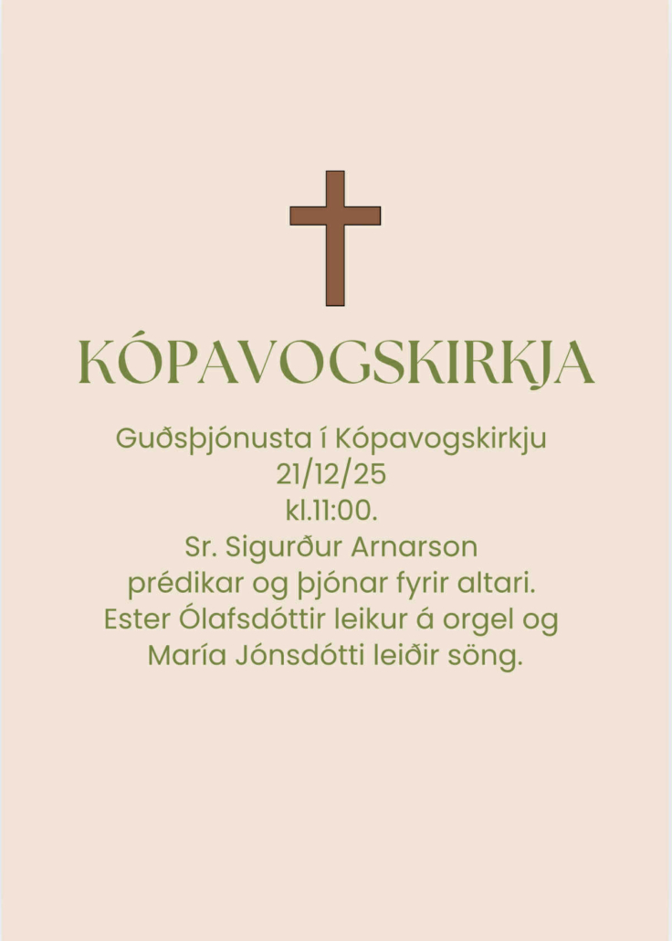 Guðaþjónusta í Kópavogskirkju kl. 11:00 þann 21. desember 2025desember 20, 2025 - 10:55 f.h.