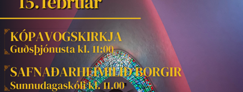 Guðsþjónusta verður í Kópavogskirkju sunnudaginn 15. febrúar kl. 11.00. Sr. Grétar Halldór Gunnarsson prédikar og þjónar fyrir altari. Kór Kópavogskirkju syngur og Elísa Elíasdóttir er organisti. Á sama tíma verður sunnudagaskóli, leiddur af æskulýðsleiðtogum Kópavogskirkju og Sr. Sigurði Arnarsyni. Verið velkomin!