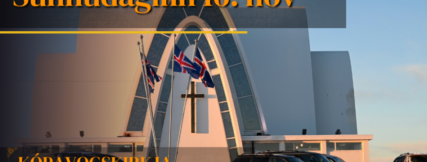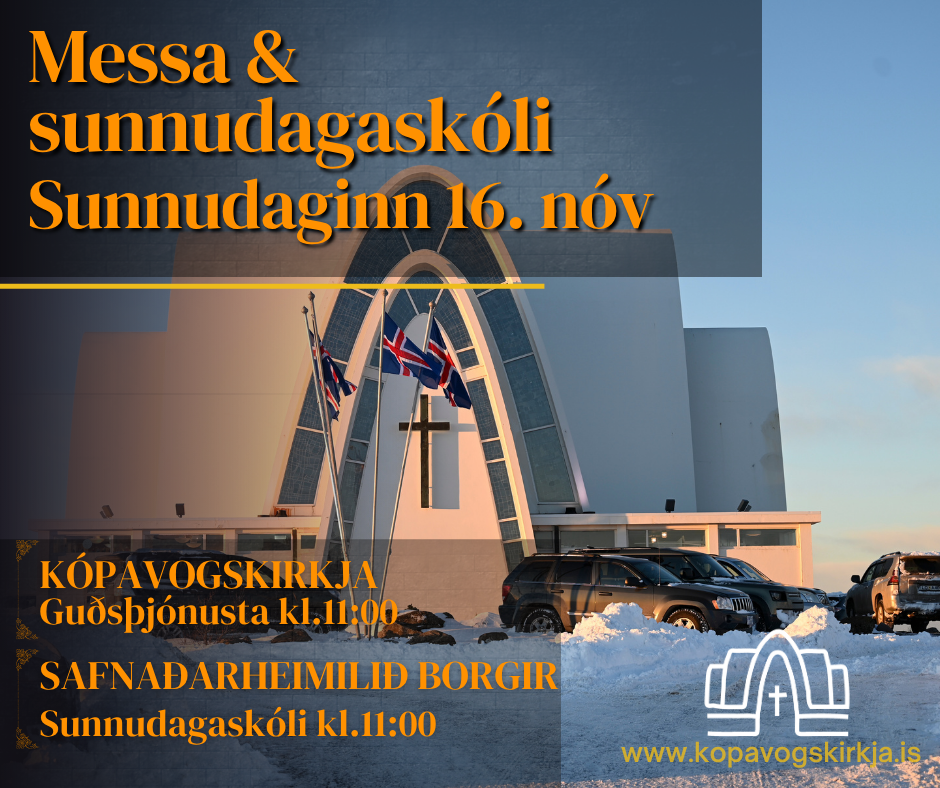 Sunnudaginn 16. nóvember verður messa við Kópavogskirkju kl. 11.00. Sr. Grétar Halldór Gunnarsson prédikar og þjónar fyrir altari, kór Kópavogskirkju syngur og Elísa Elíasdóttir er organisti. Á sama tíma, kl. 11.00 er sunnudagaskólinn á sínum stað, í Borgum safnaðarheimili Kópavogskirkju, leiddur af æskulýðsleiðtogum kirkjunnar.