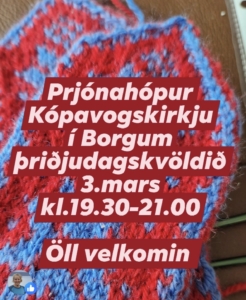 Prjónahópur Kópavogskirkju 3/3/26 kl.19:30-21:00mars 2, 2026 - 3:43 e.h.- Kópavogskirkja- Karlakaffi 3/3/26 kl.10:30-11:30mars 1, 2026 - 6:28 e.h.